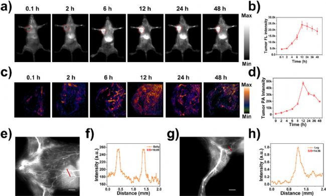 就體內(nèi)近紅外二區(qū)熒光及光聲成像而言,將BBT-TIT納米顆粒(濃度830 µm,體積150 µL)經(jīng)靜脈注射入荷4T1腫瘤的小鼠體內(nèi)。注射前,腫瘤區(qū)域和血管中的基線(xiàn)近紅外二區(qū)熒光和光聲信號(hào)均極微弱(圖6a-d)。注射后,在近紅外二區(qū)熒光圖像中最早于注射后6分鐘就觀(guān)察到腹部和后肢血管的清晰顯影(圖6e,g),計(jì)算得到的信背比分別為18.09和14.36(圖6f,h),證實(shí)了BBT-TIT納米顆粒在高對(duì)比度血管成像中的應(yīng)用價(jià)值。注射后6小時(shí)腫瘤區(qū)域開(kāi)始出現(xiàn)明顯的近紅外二區(qū)熒光信號(hào),并逐漸增強(qiáng),在注射后12小時(shí)達(dá)到峰值(圖6a,b),這表明BBT-TIT納米顆粒通過(guò)增強(qiáng)滲透滯留效應(yīng))在腫瘤內(nèi)實(shí)現(xiàn)了有效的富集。注射24小時(shí)后腫瘤熒光信號(hào)逐漸減弱,推測(cè)是納米顆粒代謝清除所致。同樣地,腫瘤組織中的光聲信號(hào)也持續(xù)增加,在注射后12小時(shí)達(dá)到最大值(圖6c,d)。