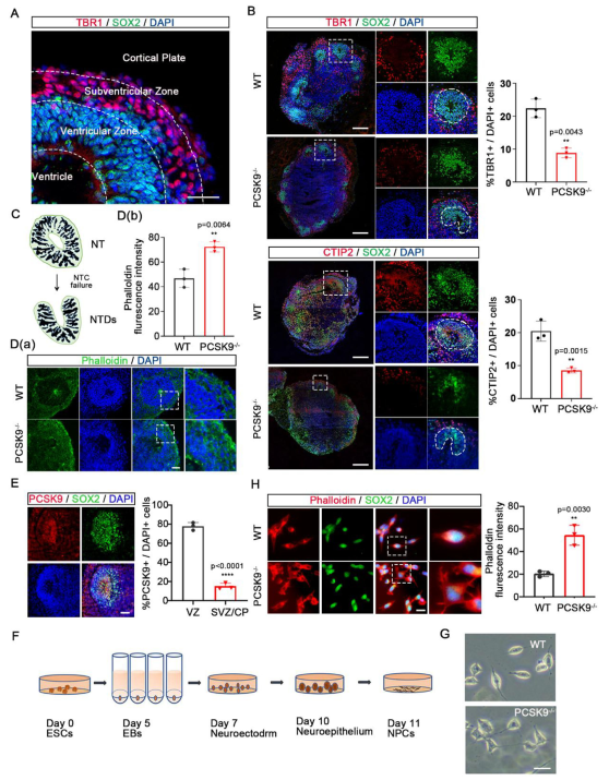 (A)NOs表現(xiàn)出三種不同的NT結(jié)構(gòu):心室、心室區(qū) (VZ)和心室下區(qū)/皮質(zhì)板SVZ/CP。(B)WT和 PCSK9-/- NO中成熟神經(jīng)元的免疫熒光染色結(jié)果。正方形表示NT結(jié)構(gòu),而白色圓形或不規(guī)則形狀表示VZ區(qū)域。(C)異常NTC引起的NTD示意圖。(D)WT和 PCSK9-/- NO的NT結(jié)構(gòu)中細胞微絲的免疫熒光染色結(jié)果。(E)熒光染色顯示PCSK9在WT NO的NT結(jié)構(gòu)中的定位和表達結(jié)果。(F)NPC誘導(dǎo)培養(yǎng)模型圖。(G)WT 和PCSK9-/- NPC的代表性光學(xué)結(jié)果。(H)WT和PCSK9-/- NPC中細胞微絲的免疫染色結(jié)果。[1]