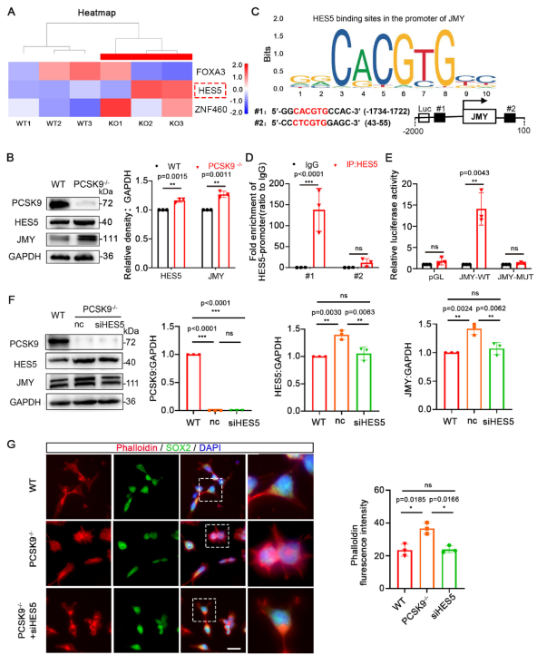 (A)轉(zhuǎn)錄組數(shù)據(jù)庫中FOXA3、HES5和ZNF460表達水平的熱圖。(B)WT和PCSK9-/- NO中PCSK9、HES5 和JMY蛋白水平的WB結(jié)果。(C)HES5-JMY結(jié)合位點的預(yù)測。(D)JMY啟動子兩個位點HES5富集的ChIP-qPCR分析結(jié)果。(E)熒光素酶報告基因?qū)嶒烌炞CHES5表現(xiàn)出針對JMY的轉(zhuǎn)錄活性;(F)siHES5拯救實驗后NPC中PCSK9、HES5和JMY蛋白水平的WB結(jié)果。(G)WT和PCSK9-/- NPC中細胞微絲的免疫熒光染色結(jié)果。[1]