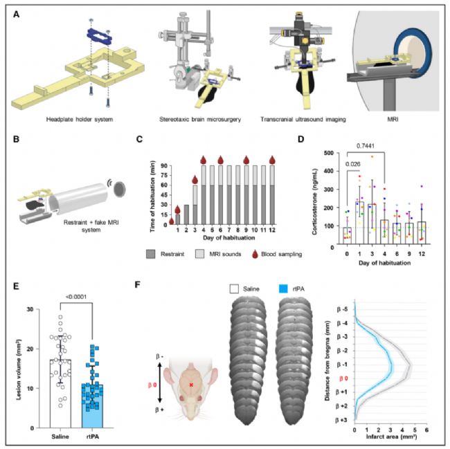 Figure 1:清醒小鼠模型構(gòu)建、應(yīng)激驗證與rtPA療效基礎(chǔ)評估