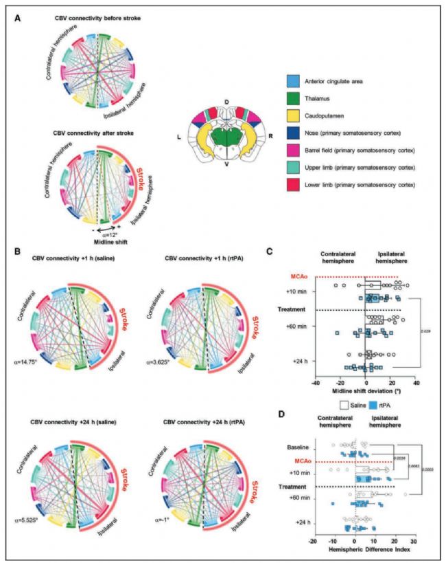 A-C 通過功能超聲繪制大腦區(qū)域間的連接圖,并引入功能性中線移位指標,發(fā)現(xiàn)卒中后連接迅速失衡(fMLS增加),而rtPA治療能快速減輕這種移位。