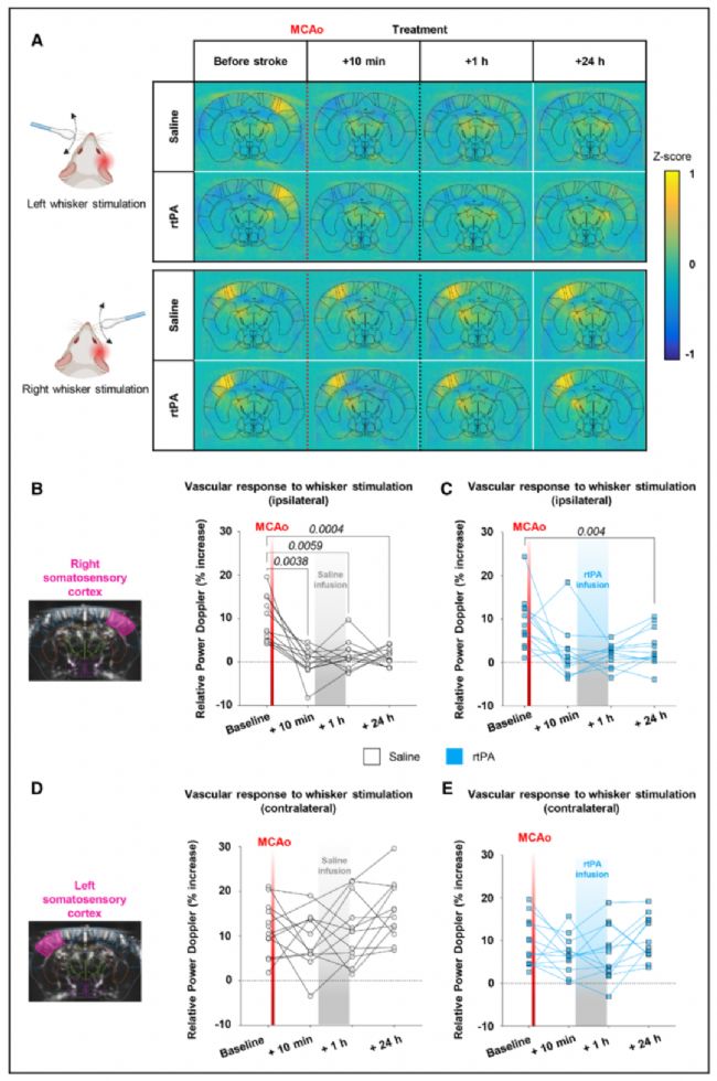 B-E 顯示卒中幾乎完全阻斷了患側(cè)大腦對觸須刺激的血流反應(yīng)。在對照組中該功能缺失持續(xù)存在,而rtPA治療組在24小時顯示出部分功能恢復(fù),且恢復(fù)程度與較小的梗死體積相關(guān)。
