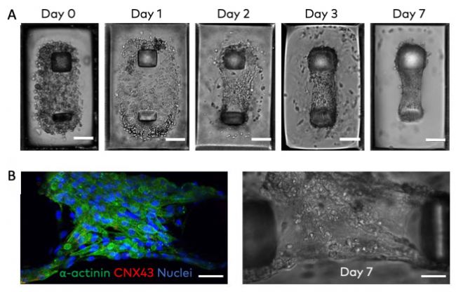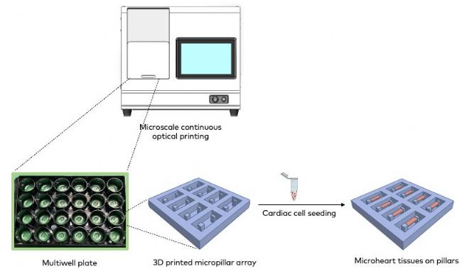 CELLINK 團(tuán)隊(duì)采用專利數(shù)字光處理(DLP)BIONOVA X生物3D 打印機(jī),在標(biāo)準(zhǔn)多孔板中直接打印出高精度微柱陣列,再接種人類誘導(dǎo)多能干細(xì)胞衍生心肌細(xì)胞(iPSC-CMs),成功構(gòu)建出 “微柱上的心臟” 模型。