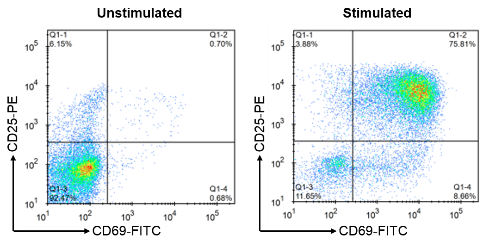 使用人CD3/CD28 T細(xì)胞激活磁珠,刺激CD3+ T細(xì)胞24到48小時(shí),細(xì)胞用FITC anti-human CD69抗體(克隆號(hào)FN50 )和PE anti-human CD25抗體(克隆號(hào)BC96)標(biāo)記,進(jìn)行流式細(xì)胞儀分析。刺激前后CD25+ CD69+ T細(xì)胞占總細(xì)胞的比例分別為0.70% 和75.81%;T細(xì)胞-Day5-細(xì)胞增殖明顯。