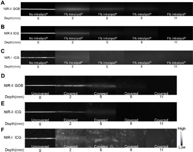在不使用脂肪乳溶液的情況下,裝有GOB NPs水溶液的毛細(xì)管在近紅外二區(qū)窗口測(cè)得的半高全寬值為522.90±2.64 μm,這清晰地勾勒出毛細(xì)管輪廓。而裝有ICG水溶液的毛細(xì)管在近紅外一區(qū)和近紅外二區(qū)窗口的FWHM值分別為557.60±16.22 μm和525.40±9.17 μm。隨著沉浸深度增加,組織吸收和散射效應(yīng)變得明顯。GOB NPs水溶液毛細(xì)管在近紅外二區(qū)窗口的FWHM值隨2、5、8、11毫米深度依次增至1672.66±34.52 μm、2496.64±25.82 μm、3815.70±169.12 μm和5159.43±59.13 μm(圖1A)。當(dāng)沉浸深度為8毫米時(shí),毛細(xì)管輪廓仍保持可見(jiàn)。對(duì)于ICG水溶液毛細(xì)管,在近紅外二區(qū)窗口的FWHM值隨2、5、8、11毫米深度分別達(dá)到2277.49±63.38 μm、3443.93±34.99 μm、4919.09±115.64 μm和5218.40±28.74 μm(圖1B)。在近紅外一區(qū)窗口,ICG水溶液毛細(xì)管在2、5、8、11毫米深度的FWHM值依次為4990.79±61.34μm、5228.48±66.10 μm、5275.77±57.70 μm和5252.94±81.65 μm(圖1C)。其近紅外二區(qū)熒光圖像的最大可識(shí)別深度為5毫米。當(dāng)沉浸深度達(dá)到2毫米時(shí),ICG水溶液毛細(xì)管的近紅外一區(qū)熒光圖像清晰度顯著下降至幾乎無(wú)法分辨的程度。