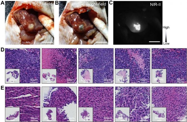 在瘤內(nèi)注射GOB NPs后,在白光下觀察到腫瘤內(nèi)快速染料擴(kuò)散(圖2A,B),通過(guò)NIR-II成像獲得的熒光信號(hào)與腫瘤的視覺(jué)輪廓相關(guān)(圖2C)。病理結(jié)果顯示熒光圖像信號(hào)與腫瘤的實(shí)際邊界一致(圖2D,E),從而證實(shí)了肝癌組織中GOB NPs的靶向聚集。