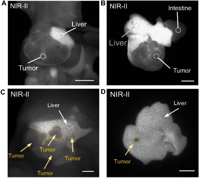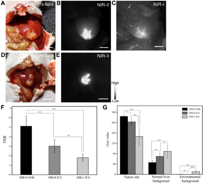 本文要點(diǎn):準(zhǔn)確識(shí)別肝癌切除手術(shù)中的腫瘤邊界對(duì)于改善患者預(yù)后和減少術(shù)后并發(fā)癥至關(guān)重要。本研究探討了一種新型半乳糖靶向納米熒光探針(Gal–OH-BDP NPs,簡(jiǎn)稱GOB NPs)在動(dòng)物原位肝細(xì)胞癌模型中實(shí)現(xiàn)近紅外二區(qū)熒光成像的可行性。在動(dòng)物原位肝癌模型中進(jìn)行的活體近紅外一區(qū)/二區(qū)成像顯示,瘤內(nèi)注射GOB NPs能實(shí)現(xiàn)其在肝癌組織中的靶向富集。GOB NPs的近紅外二區(qū)成像在腫瘤部位展現(xiàn)最高熒光強(qiáng)度,具有最高的腫瘤/正常肝組織信噪比和最優(yōu)的腫瘤邊界分辨能力。經(jīng)靜脈注射后,GOB NPs顯示出陰性染色特征,從而清晰勾勒出腫瘤邊界,在腫瘤與肝組織間形成鮮明對(duì)比。研究結(jié)果證實(shí),這種半乳糖靶向的近紅外二區(qū)納米探針不僅能通過(guò)靶向作用精準(zhǔn)區(qū)分腫瘤與正常組織,還能在深層組織中保持顯著的對(duì)比度優(yōu)勢(shì)。這種性能特點(diǎn)使其在臨床肝癌精準(zhǔn)切除術(shù)中具有重要的應(yīng)用潛力;诖耍珿OB NPs為提升肝癌手術(shù)的精確度提供了新的技術(shù)解決方案。