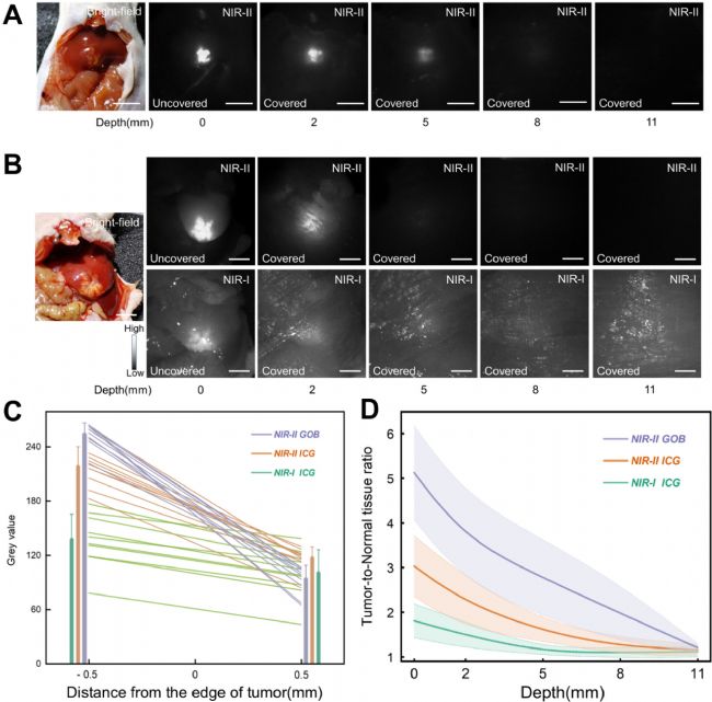 當(dāng)覆蓋2、5、8及11毫米不同厚度的雞胸組織時(shí),裝載GOB NPs水溶液的毛細(xì)管在近紅外二區(qū)窗口的半高全寬值分別為939.85±49.31 μm、1923.54±50.14 μm、3771.95±286.18 μm和5996.67±258.70 μm(圖1D)。同樣地,在相同雞胸組織厚度條件下,裝載ICG水溶液的毛細(xì)管在近紅外二區(qū)窗口的FWHM值分別為1471.60±49.27 μm、3112.21±142.69 μm、5776.92±236.61 μm和6119.07±188.00 μm(圖1E)。在近紅外一區(qū)窗口,裝載ICG水溶液的毛細(xì)管在相同組織厚度下的FWHM值則分別為3155.22±127.63μm、4748.15±376.32 μm、5928.54±142.08 μm和6242.55±106.63 μm(圖1F)。與脂肪乳浸沒(méi)成像結(jié)果一致,GOB NPs水溶液在近紅外二區(qū)窗口的最大成像深度為8毫米;而ICG水溶液在近紅外二區(qū)窗口的最大成像深度為5毫米,在近紅外一區(qū)窗口僅為2毫米。這些數(shù)據(jù)進(jìn)一步證實(shí)了GOB NPs相較于ICG在組織穿透性方面的顯著優(yōu)勢(shì)。