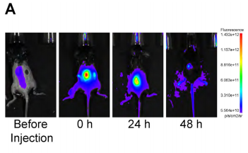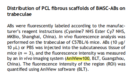 文章中,研究團(tuán)隊(duì)利用廣州博鷺騰的AniView多模式動(dòng)物活體成像系統(tǒng)觀察了BMSC-ABs在小鼠創(chuàng)傷部位及周邊組織的動(dòng)態(tài)分布與留存時(shí)間。實(shí)驗(yàn)結(jié)果顯示,經(jīng) Cy7-NHS標(biāo)記的BMSC-ABs在小鼠創(chuàng)傷部位的熒光信號(hào)于創(chuàng)傷后 2 天內(nèi)仍能清晰檢測到,之后隨時(shí)間推移逐漸減弱,到注射后 2 天時(shí)信號(hào)強(qiáng)度降至初始值的 10% 以下,這表明局部注射的 BMSC-ABs 能在創(chuàng)傷區(qū)域有效留存足夠長時(shí)間。