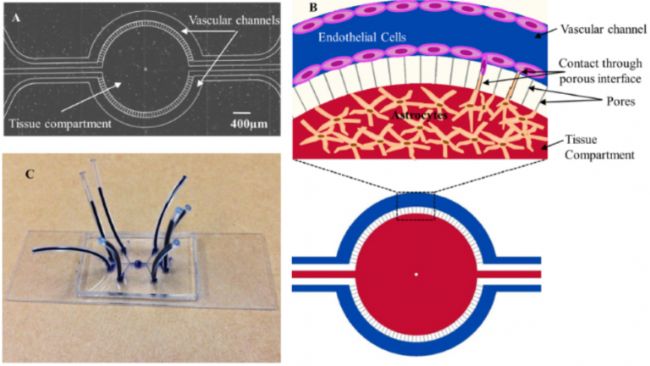 該設備的特點是有一個中央組織隔室,兩側(cè)是兩個帶有流體進入口的血管通道,組裝在顯微鏡載玻片上,配有用于進入通道的塑料管。