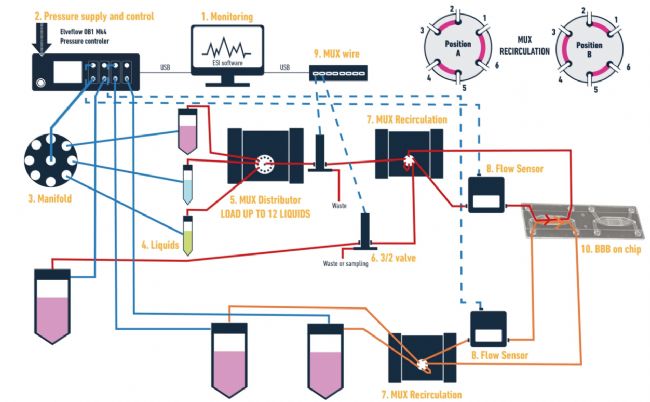 - 模擬生理流動條件:MUX 再循環(huán)裝置允許對流體進行精確、可編程的再循環(huán),這對于復制血腦屏障中內(nèi)皮細胞所經(jīng)歷的剪切應力和流體動力學至關重要。