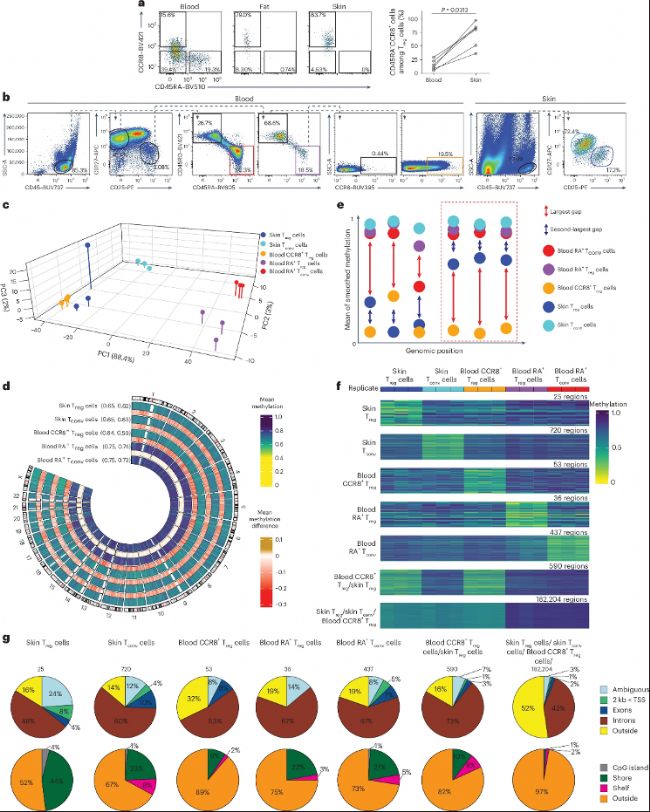 c. 對來自9例健康女性供者的血液和皮膚和血液中分離的血液CD45RA+ Treg細(xì)胞(RA+ Treg細(xì)胞)、血液CD45RA+ Tconv細(xì)胞(RA+ Tconv細(xì)胞)、血液CCR8+ Treg細(xì)胞、皮膚Tconv細(xì)胞和皮膚Treg細(xì)胞進(jìn)行DNA甲基化主成分分析。