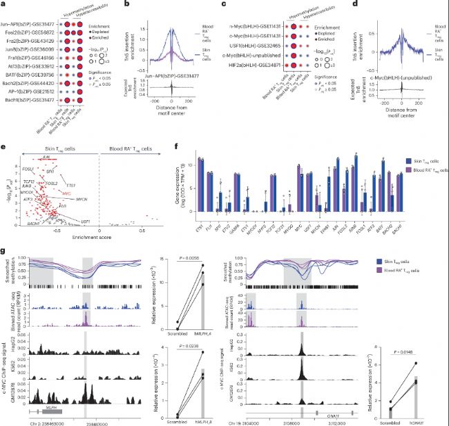 通過解析DMRs中的轉(zhuǎn)錄因子結(jié)合位點(diǎn),研究發(fā)現(xiàn)在皮膚Treg細(xì)胞低甲基化DMRs和高可及性峰中,bZIP轉(zhuǎn)錄因子(如BATF、Jun-AP1)的結(jié)合motifs中顯著富集。而bHLH轉(zhuǎn)錄因子(如c-Myc、n-Myc、USF1)motif僅富集于低甲基化DMRs,未在可及性峰值中富集。這些結(jié)果表明,bZIP因子可能在皮膚Treg細(xì)胞適應(yīng)中同時(shí)受甲基化與可及性調(diào)控,而bHLH因子可能受甲基化調(diào)控進(jìn)而發(fā)揮功能。