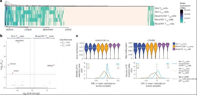 圖6:轉(zhuǎn)座元件在皮膚Treg細(xì)胞和血液CCR8+ Treg細(xì)胞中發(fā)生低甲基化