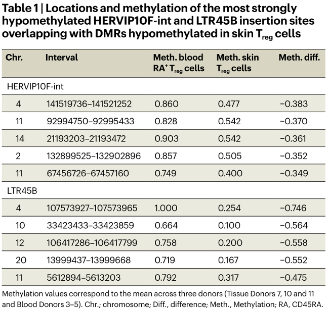 表1:與皮膚Treg細(xì)胞低甲基化DMR重疊的低甲基化最顯著HERVIP10F-int和LTR45B插入位點(diǎn)位置及甲基化水平