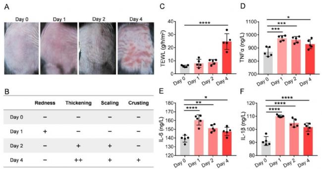 經表皮水分流失(TEWL)檢測是目前評估皮膚屏障功能廣泛使用的客觀評估方法。TEWL值升高表明皮膚屏障功能受損。本研究檢測了小鼠在紫外線照射后第0、1、2和4天的皮膚經表皮水分流失(TEWL)情況。與照射后第0天(0.84±0.75 g/m²/h)相比,照射后第4天的TEWL值(2.68±0.05 g/m²/h)顯著升高(p<0.0001),這表明紫外線誘導了皮膚屏障的破壞(圖1C)。