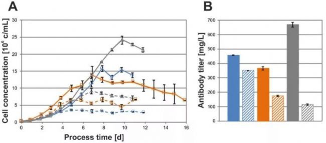 相比 batch 培養(yǎng)模式,fed-batch 策略可顯著延長(zhǎng)培養(yǎng)持續(xù)時(shí)間,提高細(xì)胞峰濃度,抗體終濃度可提高至六倍以上(數(shù)據(jù)未顯示)。