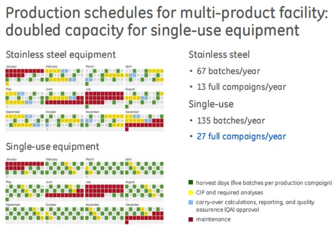 除了培養(yǎng)的性能之外,在商業(yè)化生產(chǎn)中,影響產(chǎn)能的另外一個重要因素就是周轉率。通過對XDR-50 MO一次性發(fā)酵罐與不銹鋼發(fā)酵罐全年排班對比(下圖),可以看到:由于更快的周轉率,一次性發(fā)酵罐的產(chǎn)能是不銹鋼發(fā)酵罐雙倍(一次性發(fā)酵罐全年可生產(chǎn)135批次/年,而不銹鋼則為67批次/年)。