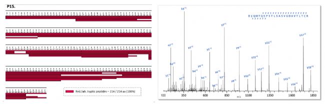 接下來,作者又結(jié)合多種碎裂方式(CID、HCD、EThcd、UVPD),進行了自上而下(TPD)的LCs蛋白表征,達到89%的氨基酸碎片覆蓋率(圖2)。為了確認沒有覆蓋到的區(qū)域,用Trypsin酶切的數(shù)據(jù)對Uniprot human蛋白數(shù)據(jù)庫+上述組裝出來的候選LC序列進行搜庫分析,結(jié)果顯示P15樣本能達到100%序列覆蓋(圖3)。另外,為了確認二硫鍵和半胱氨酸化的分布,對P15樣本進行了非還原的酶切實驗,結(jié)果發(fā)現(xiàn)二硫鍵主要發(fā)生在C23-C88和C134-C194之間,半胱氨酸化主要發(fā)生在C端。最后,為了區(qū)分I和L,又對包含I和L的多肽進行了EThcd和HCD分析,最終在P15中正確歸屬20/24個I/L的位點,其余4個通過序列同源性完成歸屬。