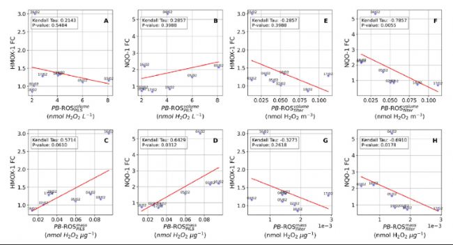 PB-ROS (PILS 和 Filter) 與 ALI 細(xì)胞暴露后 BEAS-2B 細(xì)胞氧化應(yīng)激相關(guān)基因表達(dá) / 生物學(xué)響應(yīng) (oxidative stress markers) 之間的關(guān)系 (scatter plot + regression / correlation analysis)。其原文分析指出: