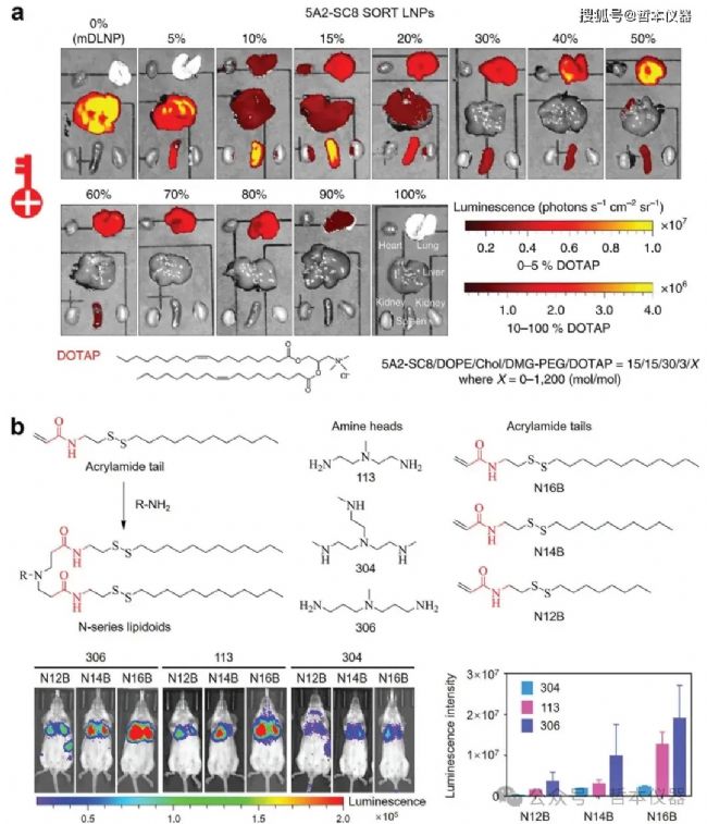另一種方法是將含酯連接基的可電離脂質(zhì)替換為含酰胺連接基的類脂質(zhì),實(shí)現(xiàn)肺靶向。例如,306-N16B LNP專門將mRNA遞送至肺部。改變N系列LNP的胺頭化學(xué)結(jié)構(gòu)也會影響其亞細(xì)胞轉(zhuǎn)染效率,當(dāng)與Cre mRNA復(fù)合時(shí),306-N16B LNP能轉(zhuǎn)染33.6%的肺內(nèi)皮細(xì)胞,而113-N16B LNP則能影響約69.6%的內(nèi)皮細(xì)胞(圖1b)。