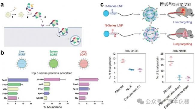 納米粒子進(jìn)入體循環(huán)后,會吸附血清蛋白和生物分子,形成生物分子冠,從而降低其表面張力。這一生物分子冠被認(rèn)為決定了器官選擇性靶向。最近研究表明,LNP的表面特性會影響生物分子冠的組成及LNP的去向。例如,SORT-LNP的表觀pKa決定其生物分子冠的特征:當(dāng)pKa < 6時(shí),𝛽2-糖蛋白I有利于脾臟靶向;pKa 6-7時(shí),ApoE促進(jìn)肝臟靶向;而pKa > 9.25時(shí),玻連蛋白則促進(jìn)肺靶向(圖6b)。