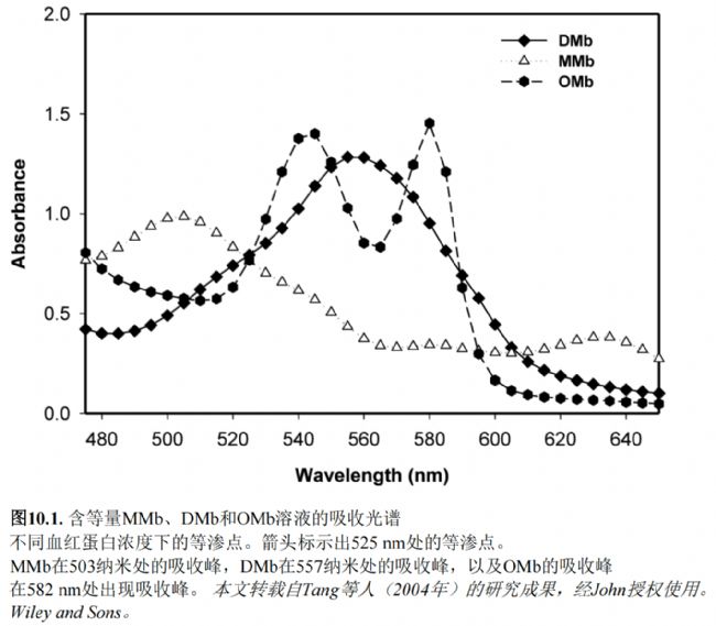 他在低溫下進行萃取,并用緩沖液控制pH值。即便如此,OMb和DMb的比例仍發(fā)生了一些變化。Krzywicki的方程(Krzywicki,1982)被廣泛用于估算 溶液中肌紅蛋白不同氧化還原形式的相對比例。有時,這些方程會為某些氧化還原形式生成負值 , 有時通過將三種氧化還原形式的總和獲得的估計值超過100%。這主要是由于在這些方程中選擇了不合適的波長(545、565和572nm)。為了解決這個問題,Tang等人(2004)使用了503 nm的波長最大值來處理MMb,557 nm用于DMb,582 nm用于OMb(圖10.1)。修訂的方程在處理負值和總和達到100%方面表現(xiàn)更好(第IX節(jié))。