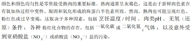 消費者有時會對熟肉的粉紅色感到敏感,懷疑產(chǎn)品可能未煮熟。因此,加工廠需要定期檢測產(chǎn)品以確定 并消除或減少不希望出現(xiàn)的粉紅現(xiàn)象。食材中亞硝酸鹽或硝酸鹽的污染 可能是導致粉紅現(xiàn)象的原因之一(希頓等人,2000年)?赏ㄟ^霍恩西(1956年)腌肉色素檢測法進行排查(詳見第XI-E和XI-F節(jié))。 烤肉表面的粉紅現(xiàn)象也會因接觸燃燒廢氣中的二氧化氮而呈陽性反應(yīng)(科恩福斯 等人,1998年)。燃燒廢氣中可能含有二氧化碳,但霍恩西(1956年)方法僅能檢測NO-血紅素復合物,無法識別CO-血紅素復合物。