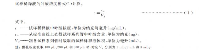 2、從標(biāo)準(zhǔn)曲線計(jì)算試樣或酶空白系列管中葉酸的相應(yīng)含量(cx),如果3支試樣系列管中有2支葉酸 含量在0.10ng~0.80ng范圍內(nèi),且各管之間折合為每毫升試樣提取液中葉酸含量的偏差小于10%,則 可繼續(xù)按式(1)、式(2)、式(3)進(jìn)行結(jié)果計(jì)算,否則需重新取樣測(cè)定。 試樣稀釋液的葉酸濃度按式(1)計(jì)算。