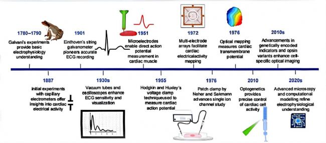 18 世紀(jì),Galvani 通過蛙腿實驗首次證實肌肉收縮由內(nèi)在電活動驅(qū)動,為心臟電生理研究奠定基礎(chǔ);1901 年前后,Einthoven 對心電圖(ECG)技術(shù)進行改進,首次實現(xiàn)心臟電生理活動的精準(zhǔn)記錄;后續(xù)發(fā)展的多電極陣列(MEA)雖可用于電信號傳播測量,但僅局限于胞外電位檢測,且空間分辨率受電極間距制約,難以滿足深入研究需求。