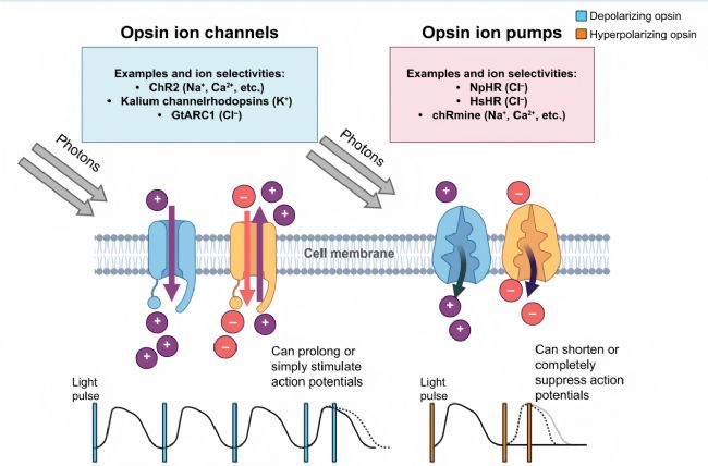 2.超極化視蛋白:鹽古菌視紫紅質(zhì)(NpHR)和鹽生鹽桿菌視紫紅質(zhì)(HsHR)可介導(dǎo)氯離子內(nèi)流,使細(xì)胞超極化;Kalium 通道視紫紅質(zhì) HcKCR1 和 WiChR 具有高鉀離子選擇性,響應(yīng)速度<1 ms,WiChR 在人誘導(dǎo)多能干細(xì)胞心房肌細(xì)胞中表達后,可在藍(lán)光照射下可逆抑制動作電位與自發(fā)收縮。