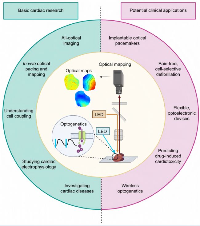 最初為研究復(fù)雜神經(jīng)元相互作用而開發(fā)的光遺傳學(xué)技術(shù),已成功轉(zhuǎn)化至心臟領(lǐng)域并取得顯著成效,其核心機制為視蛋白在波長依賴性光照下可模擬電壓門控、配體門控或機械敏感性離子通道及離子泵的作用介導(dǎo)細(xì)胞膜離子轉(zhuǎn)運,該技術(shù)不僅為心臟相關(guān)電生理機制研究提供了多項關(guān)鍵認(rèn)知,還具備進一步向臨床應(yīng)用推進的潛力。
