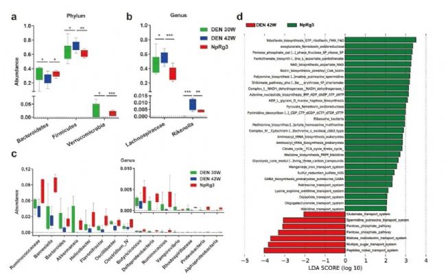 通過分析微生物的分類組成與變化特征,本研究鑒定出參與 NpRg3 抗腫瘤功能的關鍵細菌群落:擬桿菌門、硬壁菌門和蛋白菌門為四組樣本中的優(yōu)勢菌門。與 DEN-30W 組相比,DEN-42W 組擬桿菌門與疣微菌門的豐度有所下降,而 NpRg3 給藥后這兩類菌門的豐度顯著提升;反之,DEN-42W 組硬壁菌門豐度較 DEN-30W 組升高,NpRg3 處理后則明顯降低(圖 6a)。細菌屬水平分析顯示,毛螺菌屬與立克次體屬的豐度在 DEN-30W 組和 DEN-42W 組中呈上升趨勢,NpRg3 給藥后則顯著下降(圖 6b);另有 15 個細菌屬在 DEN-42W 組的豐度較 DEN-30W 組減少,而 NpRg3 處理后其豐度得到恢復性增加(圖 6c)。腸道微生物的系統(tǒng)發(fā)育與基因功能密切相關,基于群落系統(tǒng)發(fā)育調查的代謝功能分析表明:與 DEN-42W 組相比,NpRg3 組共有 29 種微生物功能顯著富集,包括核黃素生物合成、氧戊二酸鐵氧還蛋白氧化還原酶、戊糖磷酸途徑等;同時,肽鎳轉運系統(tǒng)、多糖轉運系統(tǒng)等 7 種微生物功能的豐度明顯降低(圖 6d)。