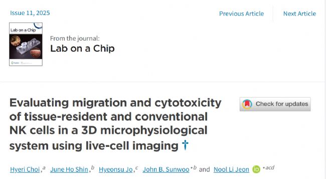 Choi, Hyeri et al. “Evaluating migration and cytotoxicity of tissue-resident and conventional NK cells in a 3D microphysiological system using live-cell imaging.” Lab on a chip vol. 25,11 2696-2707. 28 May. 2025, doi:10.1039/d4lc01095g