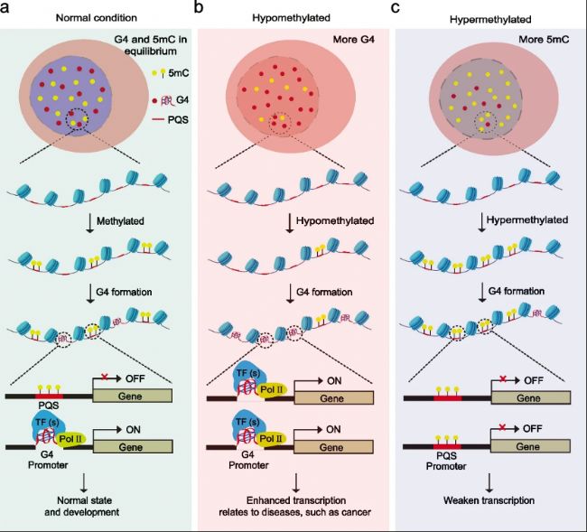 圖形摘要:G4s和5mC甲基化的基因轉(zhuǎn)錄調(diào)控機(jī)制示意圖
