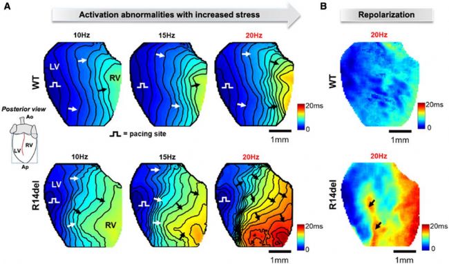 對(duì)于遺傳性心肌病,通過(guò)構(gòu)建基因敲除動(dòng)物模型,或利用患者來(lái)源的致病基因重編程 iPSC,并將其分化為心肌細(xì)胞、構(gòu)建心臟類(lèi)器官,可精準(zhǔn)檢測(cè)其電 - 鈣信號(hào)異常,如傳導(dǎo)速度減慢、復(fù)極離散度增加、鈣瞬變紊亂等,從而解析致病基因?qū)π募〖?xì)胞電生理功能的影響。在磷蛋白 R14del 突變的遺傳性心肌病模型中,標(biāo)測(cè)結(jié)果顯示,R14del 突變組心臟在 15Hz 起搏時(shí)左室 / 右室界面出現(xiàn)局部傳導(dǎo)減慢,20Hz 時(shí)形成離散的傳導(dǎo)阻滯區(qū)域,且存在顯著的室間復(fù)極梯度,與 WT 心臟形成鮮明差異,明確了該突變導(dǎo)致心律失常的電生理機(jī)制[4]。此外,利用基因敲除模型動(dòng)物的胎兒心臟,本技術(shù)可在離體狀態(tài)下記錄心臟整體電傳導(dǎo)路徑與鈣瞬變分布,揭示室間隔缺損等結(jié)構(gòu)病變相關(guān)基因在心臟電生理發(fā)育中的作用。