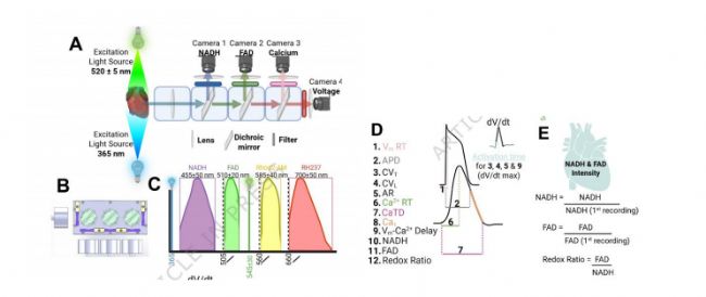 依托 NADH/FAD(氧化還原代謝標(biāo)志物)光學(xué)成像,在心肌缺血 - 再灌注模型中,可同步量化心肌不同區(qū)域的代謝底物利用(NADH 水平)、動(dòng)作電位時(shí)程(APD)、鈣瞬變特征。通過(guò)四重參數(shù)光學(xué)標(biāo)測(cè)系統(tǒng),可同時(shí)記錄 NADH、FAD、胞內(nèi)鈣(Ca2+)和跨膜電位(Vm)。研究發(fā)現(xiàn),缺血期 NADH 堆積的區(qū)域與 APD 延長(zhǎng)、傳導(dǎo)阻滯位點(diǎn)存在空間重疊關(guān)系;再灌注期代謝平衡恢復(fù)速率與電傳導(dǎo)同步性密切相關(guān),代謝調(diào)節(jié)劑可通過(guò)改善 “能量供需失衡 - 電重構(gòu)” 軸,修復(fù)電生理功能。通過(guò)將 NADH 和 FAD 強(qiáng)度進(jìn)行歸一化處理,計(jì)算氧化還原比(FAD 與 NADH 的比值),可精準(zhǔn)量化心肌代謝狀態(tài)與電生理功能的關(guān)聯(lián)程度[11]。
