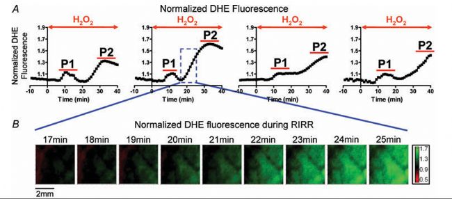通過(guò)超氧化物(O2-)光學(xué)成像(采用 DHE 熒光探針),在心肌缺血、心衰模型中,可捕捉氧化應(yīng)激的時(shí)空異質(zhì)性,定位 H2O2誘導(dǎo)的O2-高表達(dá)區(qū)域。在大鼠心臟 H2O2灌注實(shí)驗(yàn)中,O2-水平出現(xiàn)兩個(gè)峰值(P1 和 P2),延遲出現(xiàn)的 P2 振幅顯著大于 P1,且 P2 發(fā)作期間 O2-在心臟中呈波狀傳播特征,與 ROS 誘導(dǎo) ROS 釋放(RIRR)機(jī)制一致。同時(shí),技術(shù)可同步檢測(cè)該區(qū)域的鈣瞬變離散度、復(fù)極異質(zhì)性,明確 “氧化應(yīng)激→鈣穩(wěn)態(tài)失衡→心律失常易感性升高” 的病理鏈條;通過(guò)驗(yàn)證抗氧化藥物對(duì)O2-聚集的抑制效果,及對(duì)心臟電生理穩(wěn)定性的改善作用,為抗氧化 - 抗心律失常聯(lián)合干預(yù)提供實(shí)驗(yàn)依據(jù)[12]。