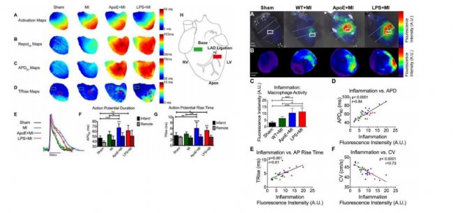 借助組織蛋白酶激活熒光傳感器 ProSense680,在動(dòng)脈粥樣硬化合并心梗模型中,可量化梗死區(qū)域及周邊的炎癥活性,同步繪制心臟原位巨噬細(xì)胞炎癥極化 / 復(fù)極圖譜(APD、傳導(dǎo)速度)。研究顯示,ApoE+MI 和 LPS+MI 組的梗死區(qū)域熒光強(qiáng)度顯著高于 WT+MI 和 Sham 組,炎癥程度與 APD80呈強(qiáng)正相關(guān),與傳導(dǎo)速度呈顯著負(fù)相關(guān),明確了 “炎癥巨噬細(xì)胞浸潤(rùn)→電傳導(dǎo)異質(zhì)性增加→心律失常” 的關(guān)聯(lián)機(jī)制。通過(guò)評(píng)估抗炎策略對(duì)炎癥區(qū)域電生理紊亂的糾正效果,可為 “抗炎 - 抗心律失常” 聯(lián)合干預(yù)提供重要依據(jù)[13]。
