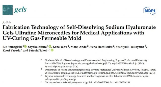 - Yamagishi R, Miura S, Yabu K, et al. Fabrication Technology of Self-Dissolving Sodium Hyaluronate Gels Ultrafine Microneedles for Medical Applications[J]. Gels, 2024, 10(1): 65.