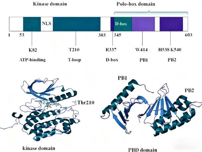 PLK1(Polo樣激酶1)是一種絲氨酸/蘇氨酸蛋白激酶,在真核細(xì)胞中廣泛表達(dá),主要參與細(xì)胞有絲分裂的起始、維持和結(jié)束過程。該蛋白由高度保守的N端激酶結(jié)構(gòu)域(KD)和C端兩個(gè)polo盒樣結(jié)構(gòu)域(PBD)組成,中間通過連接區(qū)域相連。