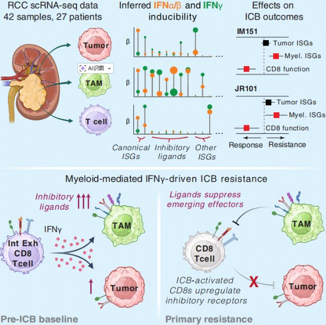文章摘要:為闡明腎細(xì)胞癌(RCC)免疫檢查點(diǎn)阻斷(ICB)耐藥機(jī)制,研究人員通過單細(xì)胞RNA測(cè)序(scRNA-seq)和推斷建模,揭示了髓系細(xì)胞(而非腫瘤細(xì)胞)的IFNγ信號(hào)傳導(dǎo)是導(dǎo)致抗PD-1/抗VEGF聯(lián)合治療原發(fā)性耐藥的關(guān)鍵因素。研究發(fā)現(xiàn)IFNγ極化的巨噬細(xì)胞高表達(dá)抑制性配體,并能在體外抑制T細(xì)胞對(duì)RCC腫瘤細(xì)胞的殺傷,這表明髓系細(xì)胞是RCC中IFN驅(qū)動(dòng)的免疫治療抵抗的介質(zhì)。