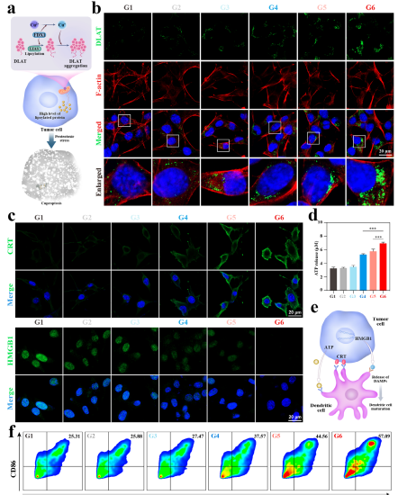 CCK-8 實驗顯示,CNO@CuMS + 超聲組的 K7M2 細胞存活率僅 35%(圖 4d),流式細胞術(shù)證實其凋亡率最高(圖 4g)。免疫熒光顯示,該組細胞表面鈣網(wǎng)蛋白(CRT)暴露、高遷移率族蛋白 B1(HMGB1)釋放最顯著(圖 5c),ATP 水平升高(圖 5d),表明 ICD 被有效激活。