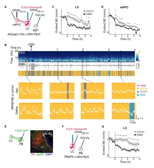 進(jìn)一步實(shí)驗(yàn)發(fā)現(xiàn)光激活藍(lán)斑核神經(jīng)元后可引起NE釋放,但慢性激活后可阻斷NE的釋放。慢性激活PB腦區(qū)LPS激活的神經(jīng)元群也可阻斷NE的釋放。