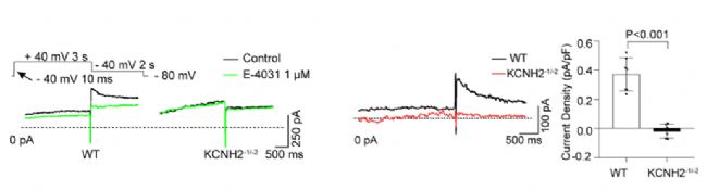 膜片鉗實(shí)驗(yàn)結(jié)果顯示,基因突變豬心室肌細(xì)胞的 IKr 峰值電流密度與尾電流密度均顯著降低,從電生理層面確認(rèn)了通道功能缺陷,圖 6 左圖為野生型與基因突變豬原代心肌細(xì)胞 IKr 電流圖(黑線為基線,綠線為 E-4031 處理后);中間圖為 E-4031 敏感性 IKr 電流(通過兩次電流相減獲得);右圖為 E-4031 敏感性電流密度統(tǒng)計(jì)分析,直觀呈現(xiàn)基因突變豬 IKr 電流密度顯著降低的特征。