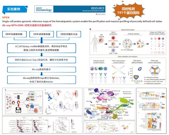 實(shí)驗(yàn)設(shè)計(jì)方面,研究團(tuán)隊(duì)收集了包括3例年輕健康、3例年老健康以及3例急性髓系白血病(AML)患者的骨髓樣本。通過對樣本中的關(guān)鍵細(xì)胞亞群(如CD34+造血干/祖細(xì)胞和CD3+ T細(xì)胞)進(jìn)行流式分選富集,并采用Ab-seq技術(shù)同時檢測最多達(dá)197種細(xì)胞表面蛋白標(biāo)志物,結(jié)合單細(xì)胞全轉(zhuǎn)錄組測序(Whole Transcriptome Analysis, WTA),實(shí)現(xiàn)了對細(xì)胞基因表達(dá)與表面蛋白水平的同時獲取,構(gòu)建出多維度的細(xì)胞狀態(tài)圖譜。