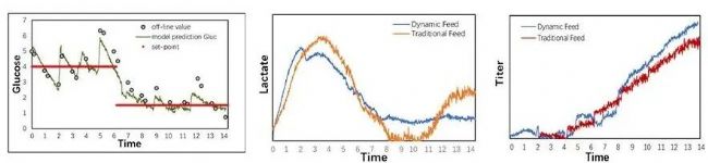 Akwa® Raman 在線拉曼分析儀可應(yīng)用于實(shí)時(shí)捕獲葡萄糖濃度的動(dòng)態(tài)變化,并基于該數(shù)據(jù)構(gòu)建閉環(huán)補(bǔ)料反饋調(diào)節(jié)體系,建立與細(xì)胞代謝需求相匹配的動(dòng)態(tài)補(bǔ)料策略,實(shí)現(xiàn)全培養(yǎng)周期葡萄糖濃度的精準(zhǔn)調(diào)控,為細(xì)胞提供最佳的生長(zhǎng)微環(huán)境。如下圖所示,相較于傳統(tǒng)手動(dòng)補(bǔ)料模式,動(dòng)態(tài)連續(xù)補(bǔ)料工藝可顯著抑制培養(yǎng)后期的乳酸累積效應(yīng),同時(shí)將目標(biāo)蛋白產(chǎn)率提高20%。在該項(xiàng)目中,基于在線拉曼分析儀構(gòu)建的動(dòng)態(tài)補(bǔ)料策略,有效推動(dòng)了工藝優(yōu)化進(jìn)程,實(shí)現(xiàn)工藝穩(wěn)定性與目標(biāo)蛋白產(chǎn)率的雙重增效。