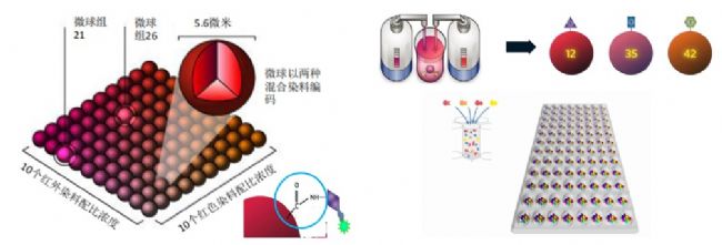 通過使用兩種不同的染料不同比例,產(chǎn)生多達100種不同顏色的微球。每種顏色的微球都具有獨特的編碼,并且只固定包被一種抗體,實現(xiàn)了編碼與靶標的一一對應。將多種不同編碼的微球混合在一起,放入同一個孔中。加入樣本和檢測抗體后,即可在一個樣本中同時檢測多種蛋白質(zhì),從而實現(xiàn)高通量檢測。