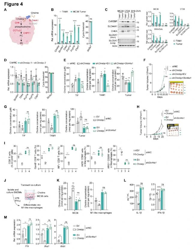 膽堿的體內獲取主要依賴轉運蛋白 SLC44A1 或 SLC5A7,作者通過對比 TAM1 細胞與 MC38 腫瘤細胞中關鍵分子表達,發(fā)現(xiàn) MC38 細胞的 ChREBP 與 SLC44A1 基因表達水平顯著高于 TAM1 細胞。進一步的體內外實驗證實,腫瘤細胞可通過高表達 ChREBP/SLC44A1 復合物,與 TAM1 細胞競爭性攝取膽堿,實現(xiàn)對腫瘤微環(huán)境中膽堿資源的優(yōu)先占據(jù),為后續(xù) TAMs 重編程奠定代謝基礎。