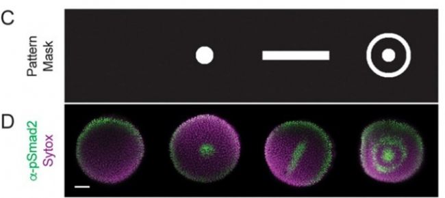 Nathan D Lord等人(2025)[6]建立了早期胚胎發(fā)育信號(hào)活動(dòng)的空間模式,利用高分辨率時(shí)空調(diào)控工具擾動(dòng)形態(tài)發(fā)生素信號(hào),有助于揭示胚胎細(xì)胞如何解碼這些信號(hào)以做出適當(dāng)?shù)拿\(yùn)決定。利用模式化照明在Nodal信號(hào)突變體中生成合成信號(hào)模式,挽救了幾個(gè)特征性的發(fā)育缺陷。為了展示空間模式化能力,將光圖案投射到球形斑馬魚(yú)胚胎群上,通過(guò)pSmad2免疫染色讀取,每個(gè)圖案位置均可生成精確的Nodal信號(hào)模式。